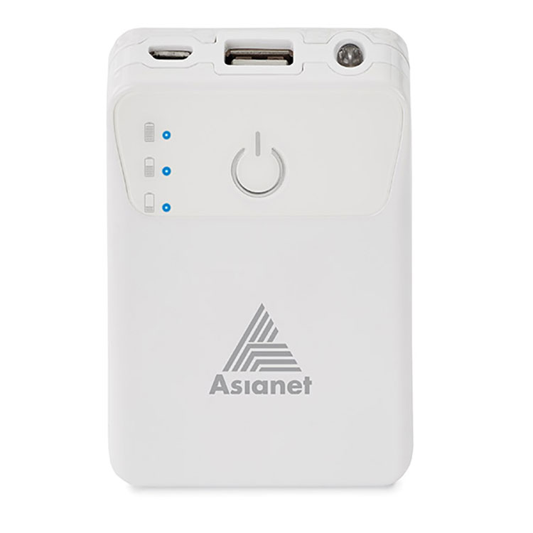 Banque de puissance avec un port USB de sortie qui supporte un courant électrique de DC 5V/21/2A rapide et efficace, une lumière blanche et indicateurs d'état DEL.