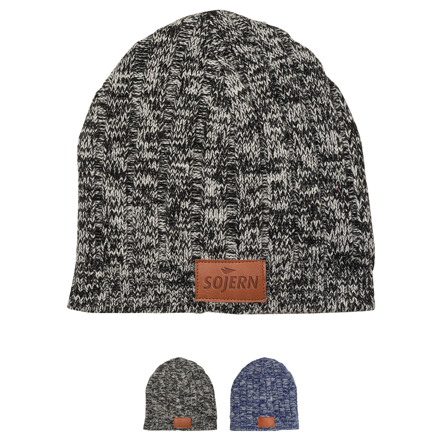 Bonnet chiné en tricot acrylique mélangé avec patch en simili cuir PU.