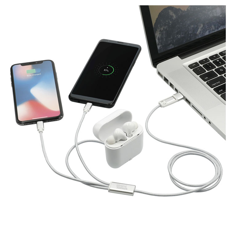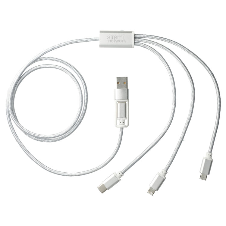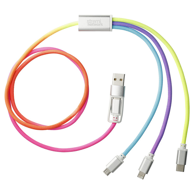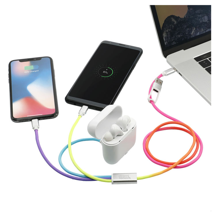 Le câble de charge Scoot 5-en-1 comprend un adaptateur USB-A et un point d'entrée de type C d'un côté et l'autre côté comprend une double pointe compatible 2-en-1 pour les appareils Apple iOS et Android (jusqu'à 2A de courant), une pointe micro (jusqu'à 3A de courant) et une pointe de sortie de type C (jusqu'à 3A de courant). En raison de la nature de la technique de teinture unique, les câbles seront similaires mais pas identiques. La variation de teinture fait partie du processus et n'est en aucun cas considérée comme un défaut.