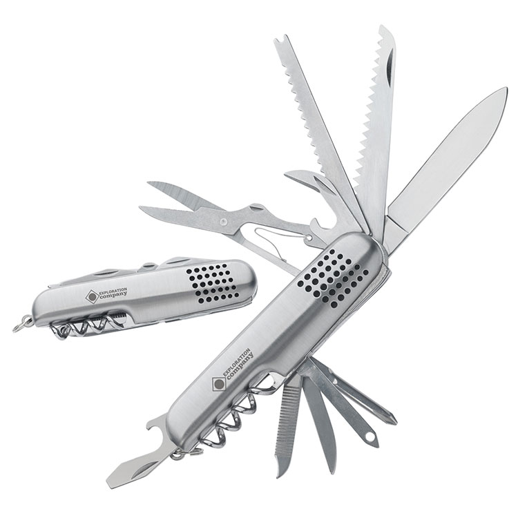 Ouvre-bouteille, ouvre-boîtes, tire-bouchon, grattoir de poisson, couteau, laser, lime à ongles, scie, ciseaux, tournevis (Phillips), un tournevis (fendu), anneau.
