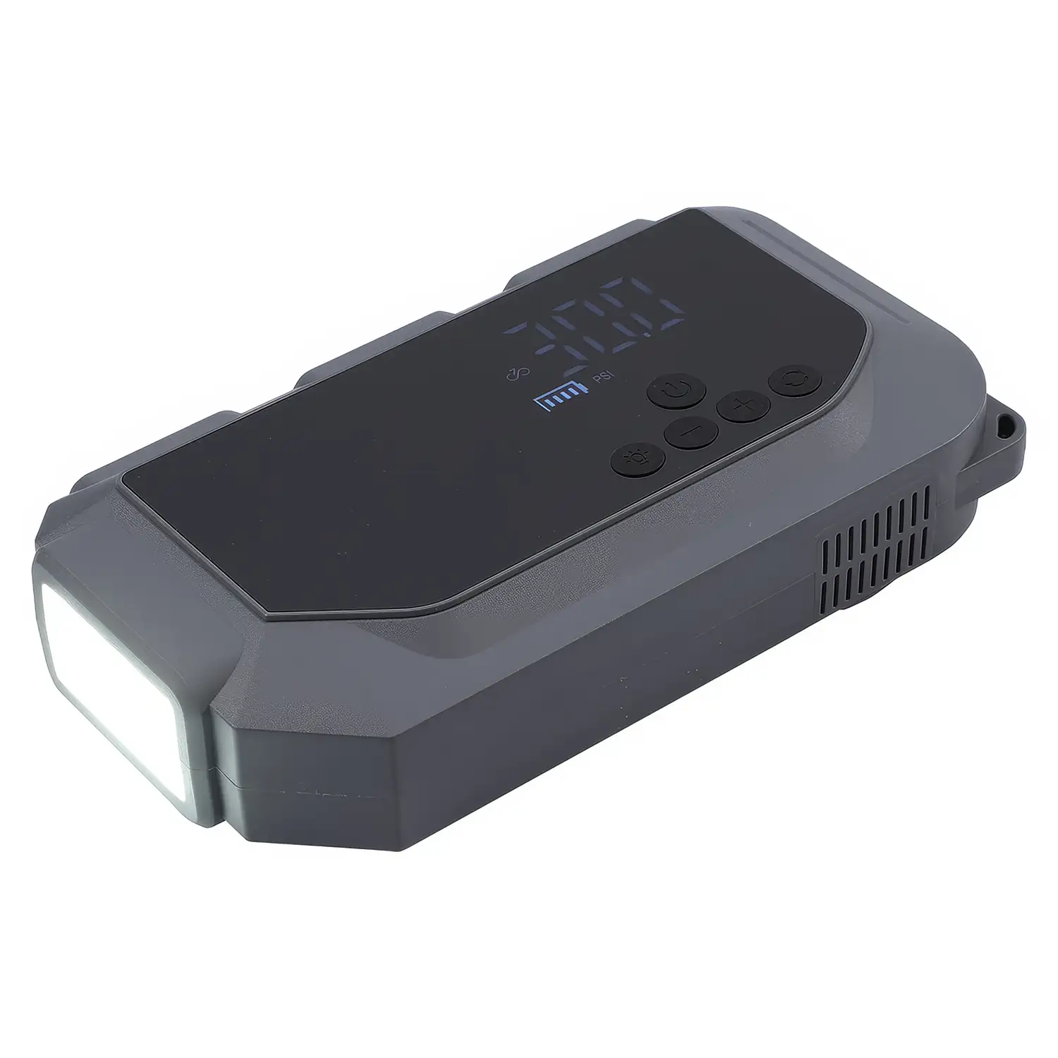 Démarreur de batterie portable puissant de 10 000 mAh avec compresseur d'air intégré et lampe de poche DEL multimode.
