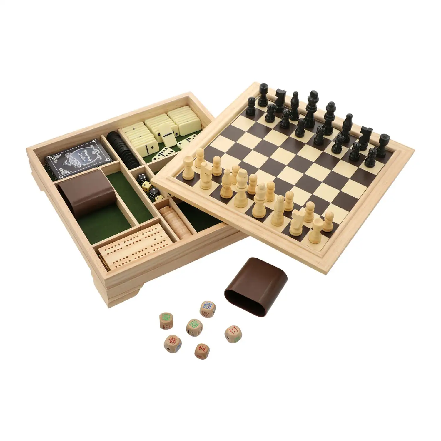 Cet ensemble pratique comprend également 28 dominos, quatre dés, un plateau de cribbage et des chevilles, et un jeu de cartes standard.