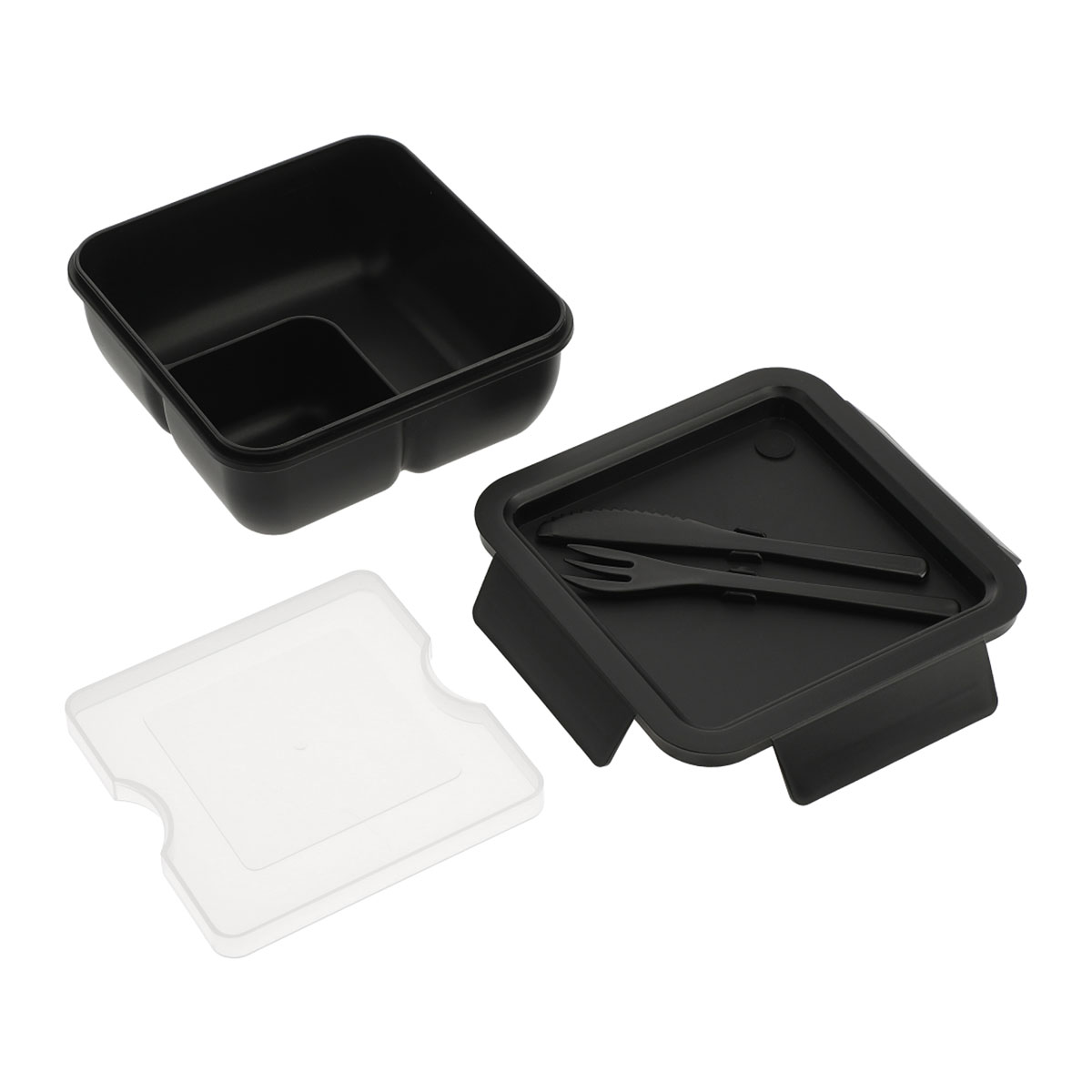 L'ensemble de lunch à emporter en plastique recyclé comprend une fourchette et un couteau.