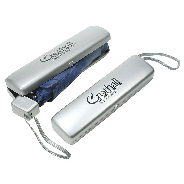 Ajoutez un logo à ce petit parapluie 43" avec étui argenté.
