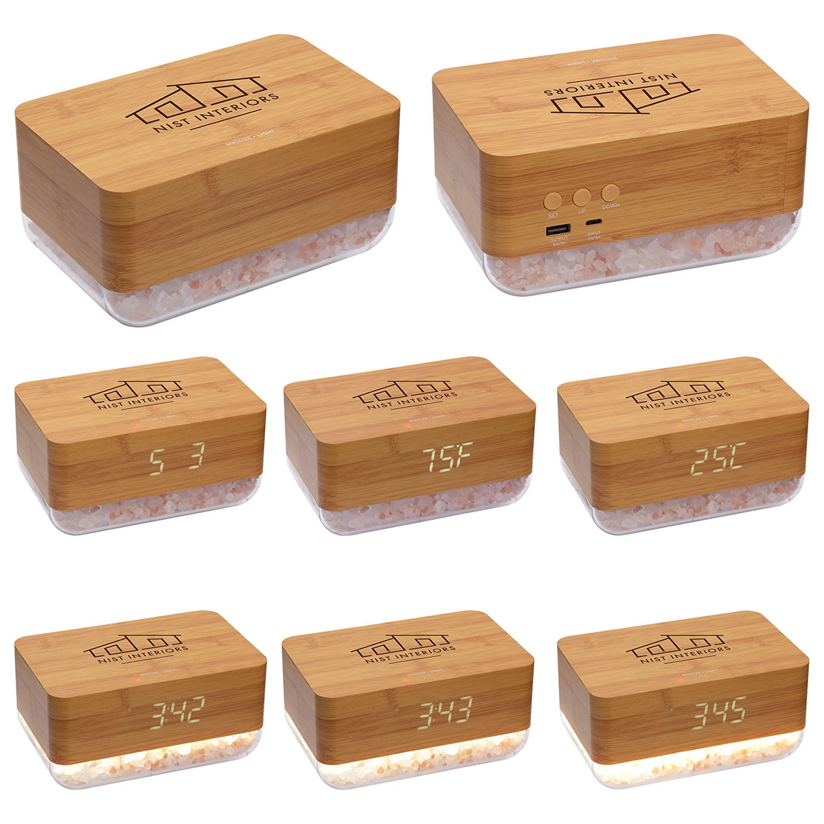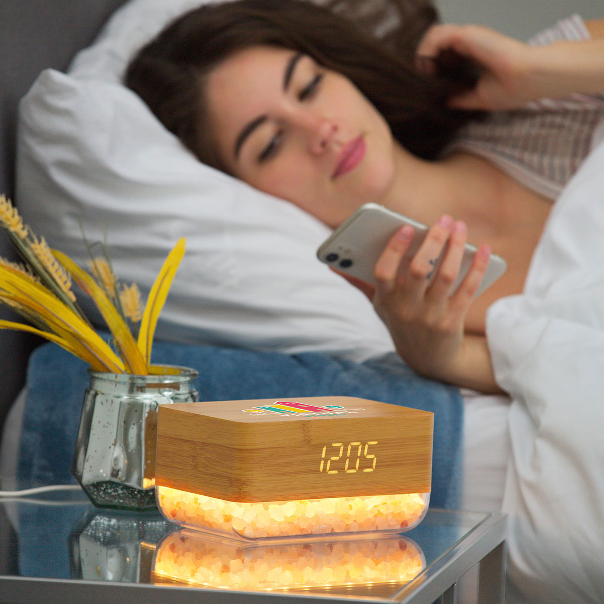Ajoutez votre logo à ce réveil Sunrise avec lampe au sel de l'Himalaya et chargeur sans fil.