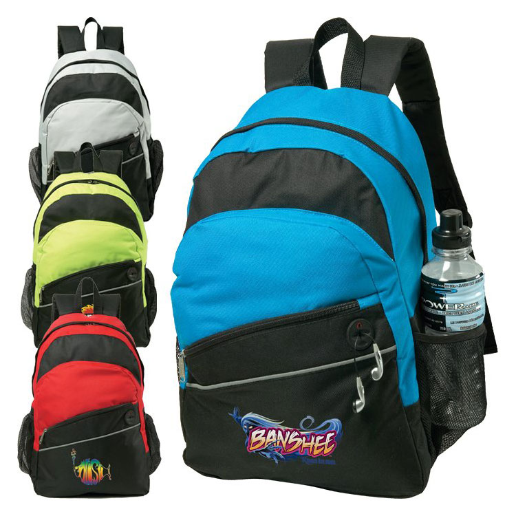Pochette avant à glissière avec porte-stylos et pochette intégrée pour lecteur MP3 et sortie pour écouteurs.