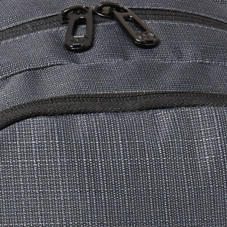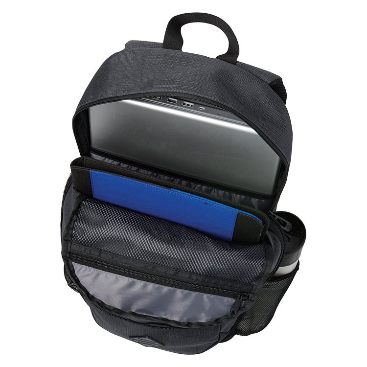 Grand compartiment principal, pochette frontale à fermeture-éclair, organiseur, deux pochettes latérales en filet, une pochette à fente matelassée et une pochette à fermeture-éclair en filet