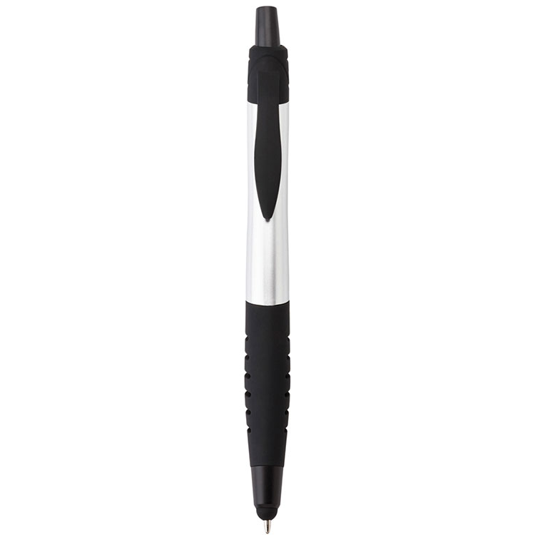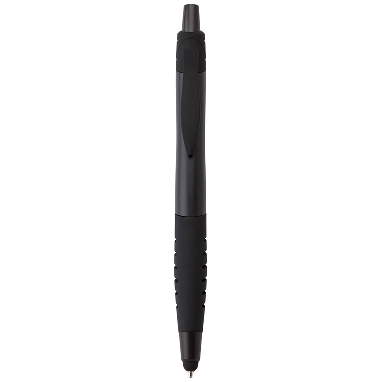 Plastique avec fini métallique mat, garniture chromée, agrafe et prise de confort caoutchoutée noire et stylet capacitif souple.