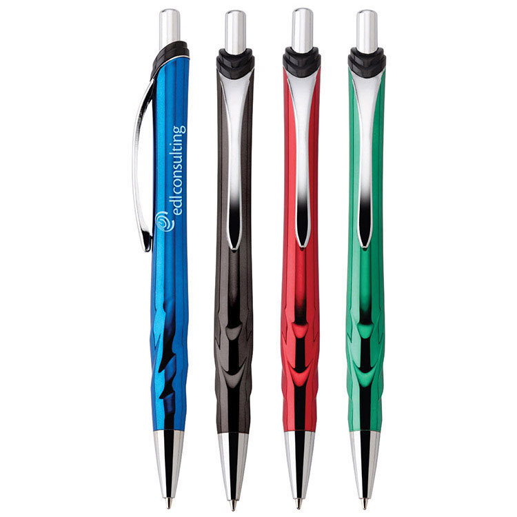 Stylo à bille à bouton-poussoir Lumina en plastique avec baril galvanisé, garniture chromée, accents en plastique noirs et stries décoratives dans le bas du baril.