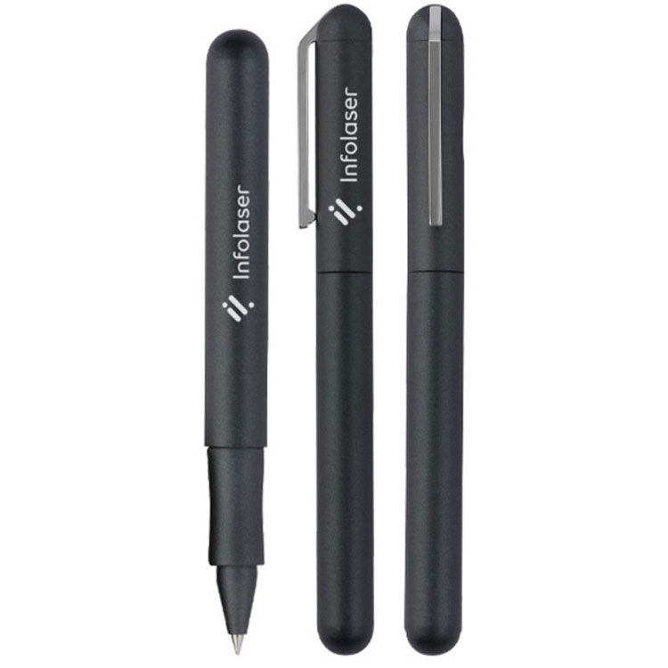 Stylo en métal à bille roulante avec capuchon et barrette chromée.