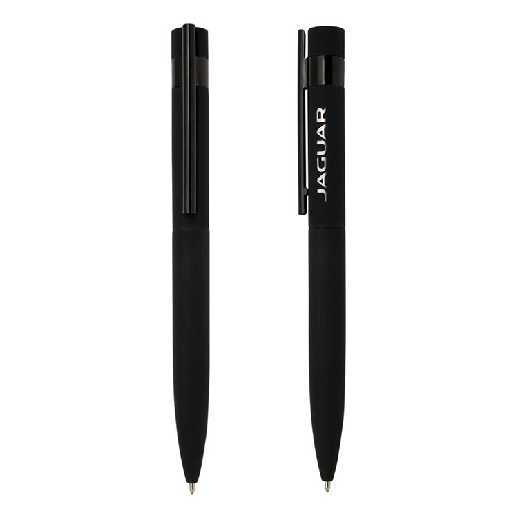 Stylo métal avec fini caoutchouté mécanisme à torsion et barrette noire élégante.