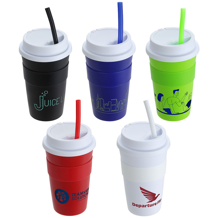 Gobelet réutilisable en PP avec manchon en silicone, couvercle et paille incluse.